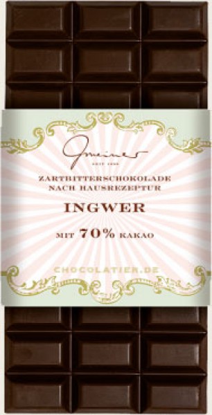 Feinste handgeschöpfte Zartbitterschokolade mit einem Kakaogehalt von 70 %. Die Kakaobohnen für diese Geschmackserlebnis kommen aus den besten Anbaugebieten Südamerikas. Die vielen kleinen kandierten Ingwerstückchen verleihen dem Schokoladenaroma eine leichte Schärfe und verleihen ihr eine besondere Note. Ein Geschmackserlebnis für höchste Ansprüche.