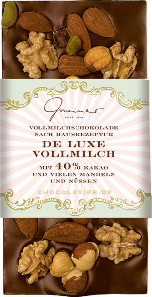 Feinste handgeschöpfte Vollmilchschokolade mit einem Kakaogehalt von 40 %. Diese edle Milchschokolade ist verfeinert mit feinsten Spanischen Mittelmeermandeln, besten Haselnüssen aus dem Piemont, knackigen französischen Walnüssen und knackigen Pistazien. Ein wunderbares Geschmackserlebnis – einfach de Luxe!