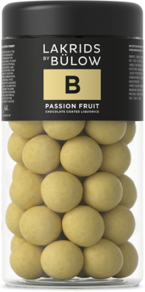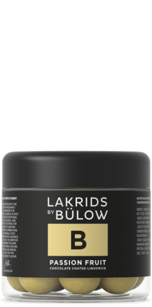 Lakrids B-: Süßer Lakritz mit erlesener weißer Schokolade und verführender Passionsfrucht. Die Säure der Passionsfrucht, die Süße der Schokolade und die Fähigkeit des Lakritzes, diese Aromen zu vereinen, gibt einen perfekten Biss. Süß, sauer und souverän - umgeben von einer zarten, knusprigen Zuckerschicht.