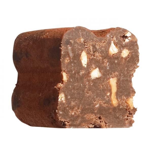 Zartbitterschokolade 41% (Zucker, Kakaomasse, Kakaobutter, Emulgator: Sojalecithin, natürliches Vanillearoma, Kakaogehalt: 52% mindestens), gehackte u.gemahlene Piemont-Haselnüsse 41%, Zucker, Kakaopulver, kann Spuren von Schalenfrüchten und Milch enthalt