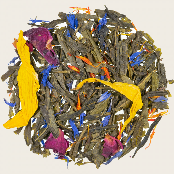Grüner Tee China Sencha, Aroma, Sonnenblumenblüten, kandierte Mangostücke (Mango, Zucker)(2%), Aprikosenstücke (Aprikose, Reismehl)(2%), Rosenblütenblätter, Kornblumenblüten, Saflorblüten