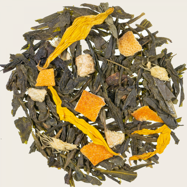 China Sencha, Ingwerstücke, Zitronenstücke, Orangenschalen, Sonnenblumenblüten, natürliches Aroma