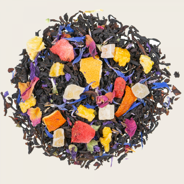 Schwarzer Tee Ceylon,- Südindien, - China, kandierte Ananas,- Mango, und Papayastücke (Ananas, Papaya, Mango, Zucker), natürliches Aroma, Orangenschalen, Rosenblütenblätter, Malvenblütenblätter, Kornblumenblütenblätter, Erdbeerstücke, Aprikosenstücke, Zi