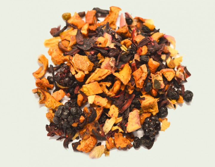 Apfelstücke, Hibiskusblüten, Holunderbeeren, Rote Beetestücke, Aroma, Brombeeren, weiße Hibiskusblüten, Vanillestücke, Rhabarberstücke