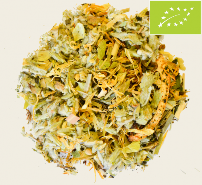 Bio Griechischer Bergtee*, Brennesselblätter*, Lemongras*, Orangenecken*, Lindenblüten*, Ringelblumenblüten*, Kamillenblumenblüten*, natürliches Zitrus- Aroma *aus kbA
