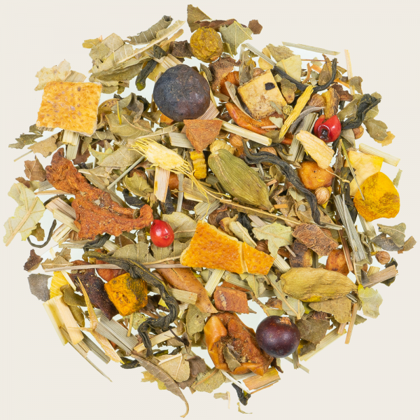Apfelstücke, Lemongras, Süßholzwurzel, grüner Tee, Brombeerblätter, natürliches Aroma, Orangenschalen, Ingwerstücke, Zimtrinde, Koriander, Wachholderbeeren, Kurkuma, Verbenenkraut, Zitronenschalen, rosa Pfeffer, Kardamom.