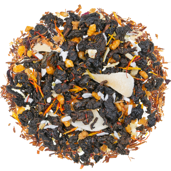 Halbfermentierter Tee (Oolong), Krokantstücke (Zucker, Haselnüsse), Aroma, Kokoschips (Kokosnuss, Zucker), Kokosraspeln, gerösteter Reis, Sesam, Saflorblüten
