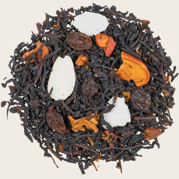 Assam- und Java Schwarztee, Apfel- Mandelaroma, Apfelstücke, Korinthen, Mandelstücke.