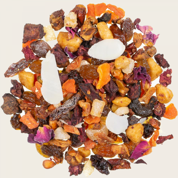 Apfelstücke, Weinbeeren, Karottenstücke, Rote Beetestücke, kandierte Papayastücke,(Papaya, Zucker), Aroma, gebrannte Mandeln (MANDELN, karamellisierter Zucker), MANDELFLAKES, Pflaumenstücke (Pflaumen, Reismehl), Rosenblütenblätter
