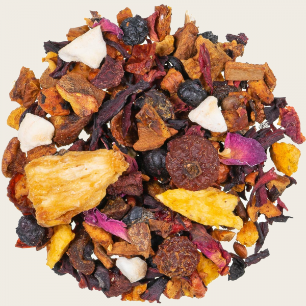 Apfelstücke, Birnenstücke (17%), Hibiskusblüten, Hagebuttenschalen, Pflaumenstücke, Zimtrinde, Ananas Chips (Ananas, Palmöl), Aroma, Granatapfelschalen (5%), Rote Beetestücke, Granatapfelkerne , Rosenblütenblätter, Heidelbeeren, Bananenstücke, Vanillestüc