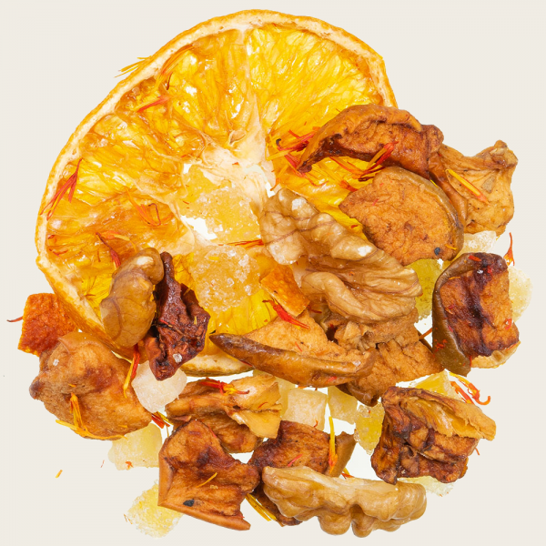 Apfelstücke (Apfel, Säuerungsmittel: Zitronensäure)(48%), Apfelscheiben(10%), kandierte Ananasstücke (Ananas, Zucker), kandierte Ingwerstücke (Ingwer, Zucker), natürliches Aroma, Mandarinenscheiben(5%), Orangenschalen, Walnussstücke, Saflorblüten
